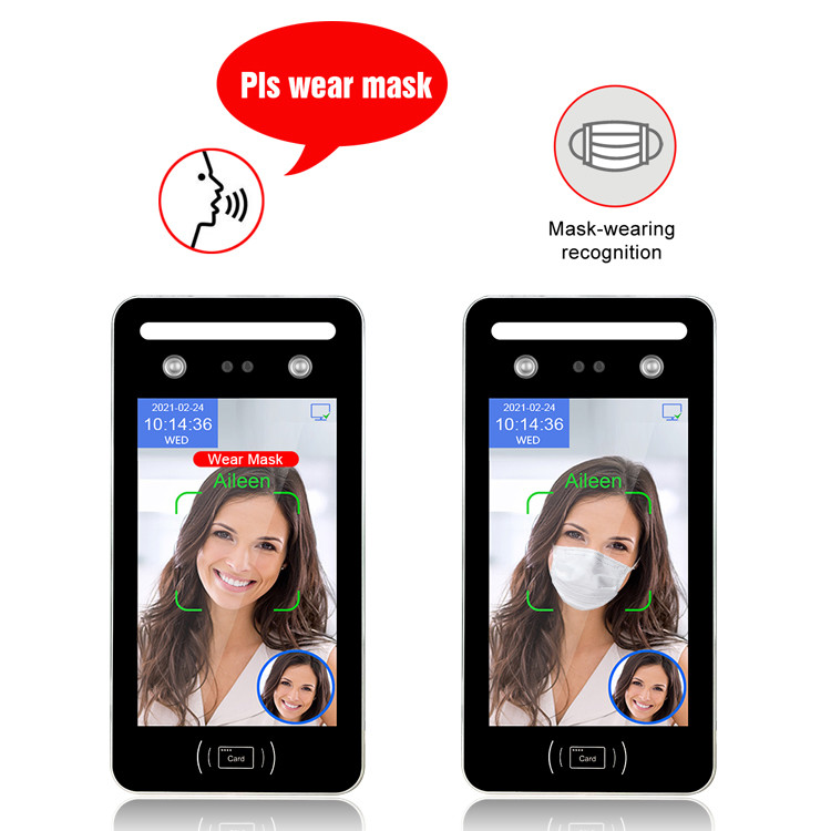 Face Recognition Attendance Machine support mask wearing face recognition detection, when you don't wear face mask, the device will say Pls wear face mask. Face recognition access control system can support live detection function with infrared camera.
