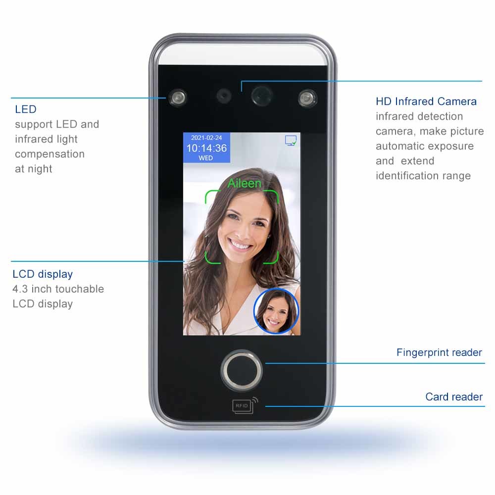 5 inch IPS HD touch screen,screen resolution: 1280*720. Dynamic face recognition, rfid card/ic card is optional, support password, face as identification.